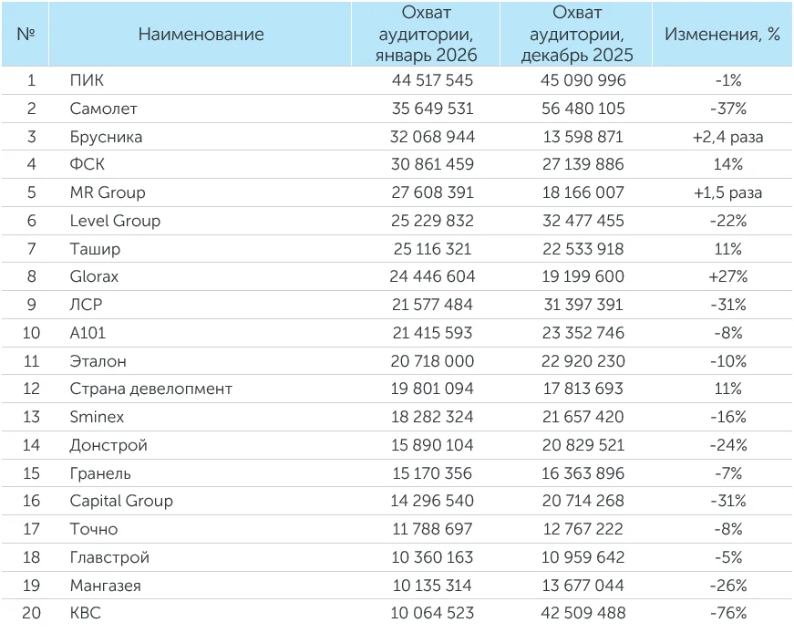 Рейтинг компаний–девелоперов за январь 2026 года